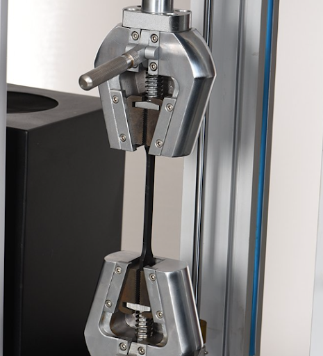 Once these parameters are set, the sample is loaded, installed between grips. Material-specific testing speed is determined by the rate of specimen straining, specimen stressing, or separation. The test rate remains constant through yield, but it can be increased when the goal is to determine elongation at break and ultimate tensile strength. With the sample in place and the parameters set, the test is run until specimen fracture or failure. The ends of the broken specimen are fitted together, and the distance between the gage marks is measured to the nearest 0.05 millimeters.